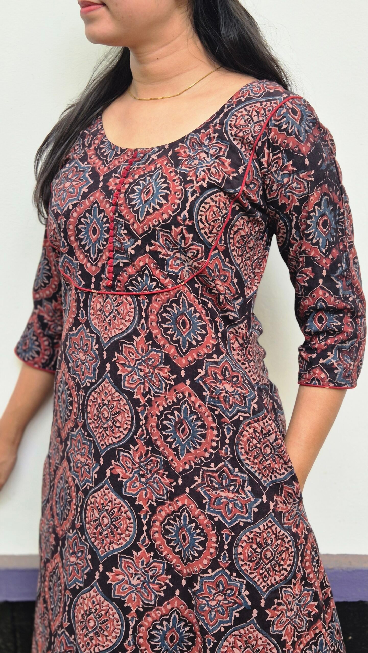 Wrap yourself in heritage with our handcrafted Ajrakh kurtis, made from 100% pure cotton.
