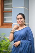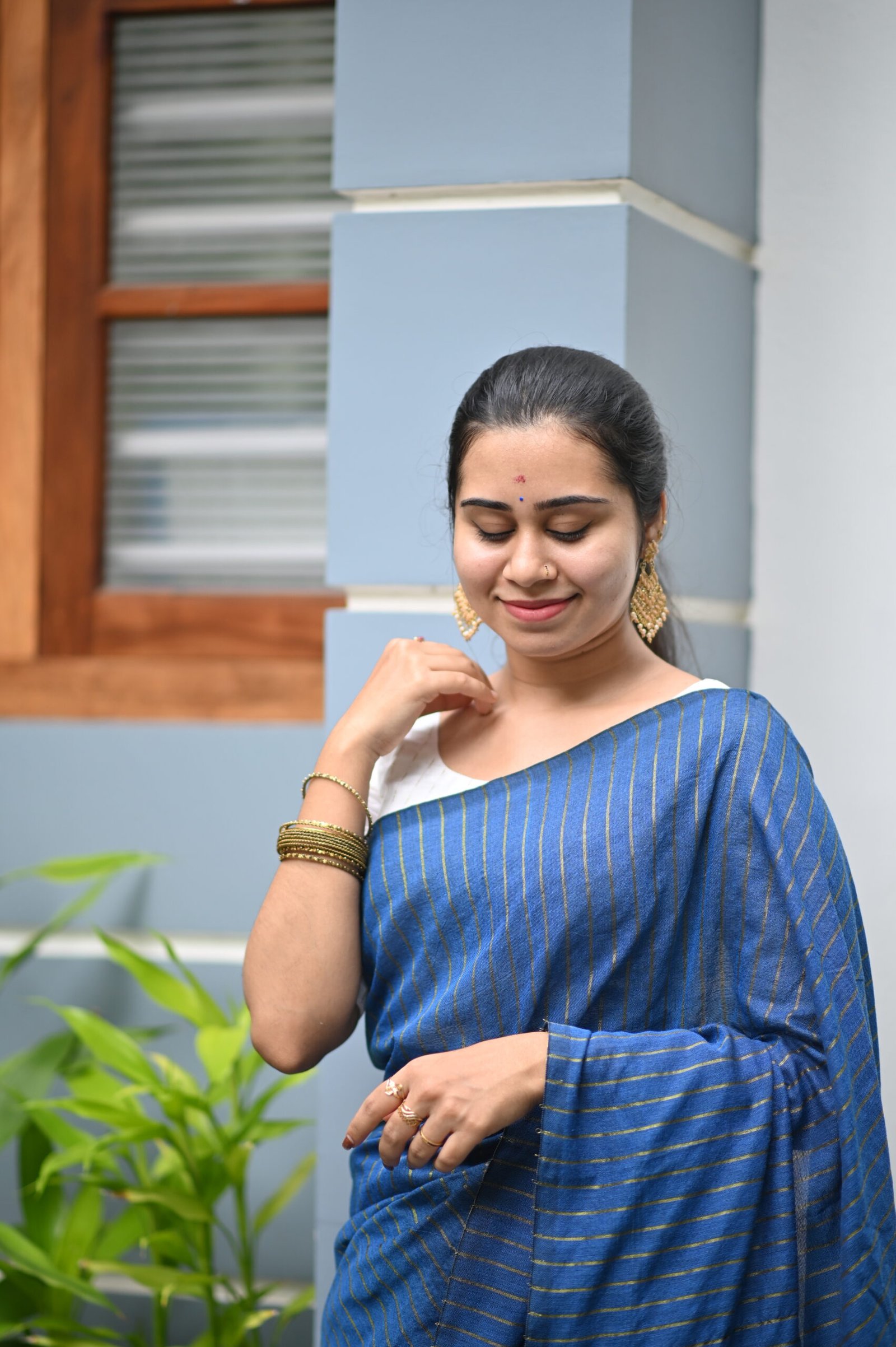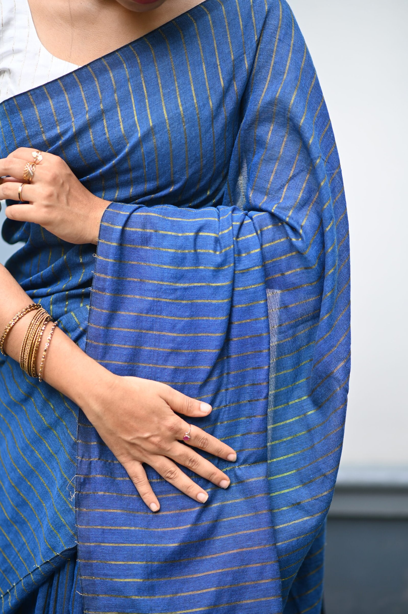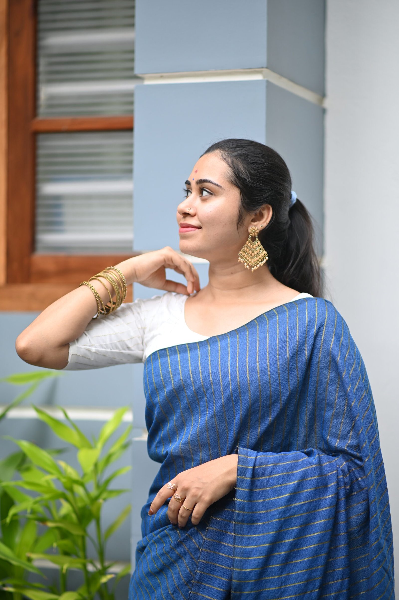 🌿 Khadi Blue striped saree with Plain blue blouse
