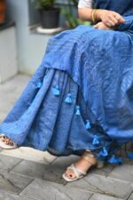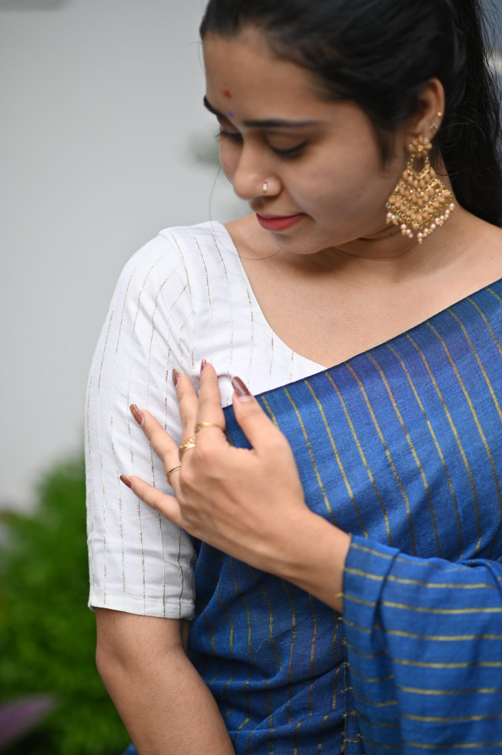 Blouse shown in the photo is for styling only. Saree comes with an unstitched matching blue blouse piece.